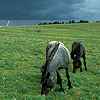 Description: horses grazing on a hill with thunderheads