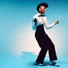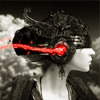 Description: Black, white, and red image of woman with futuristic helmet